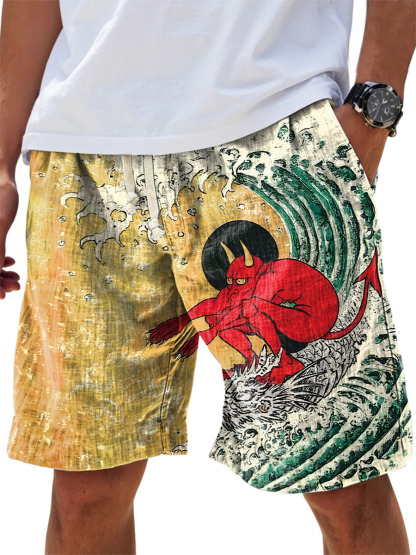 Men's Retro Japanese Waves Monster Print Cotton And Linen Beach Shorts