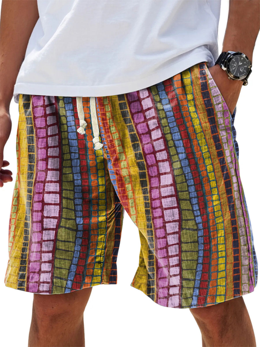 Men's Striped Dots Print Cotton And Linen Beach Shorts