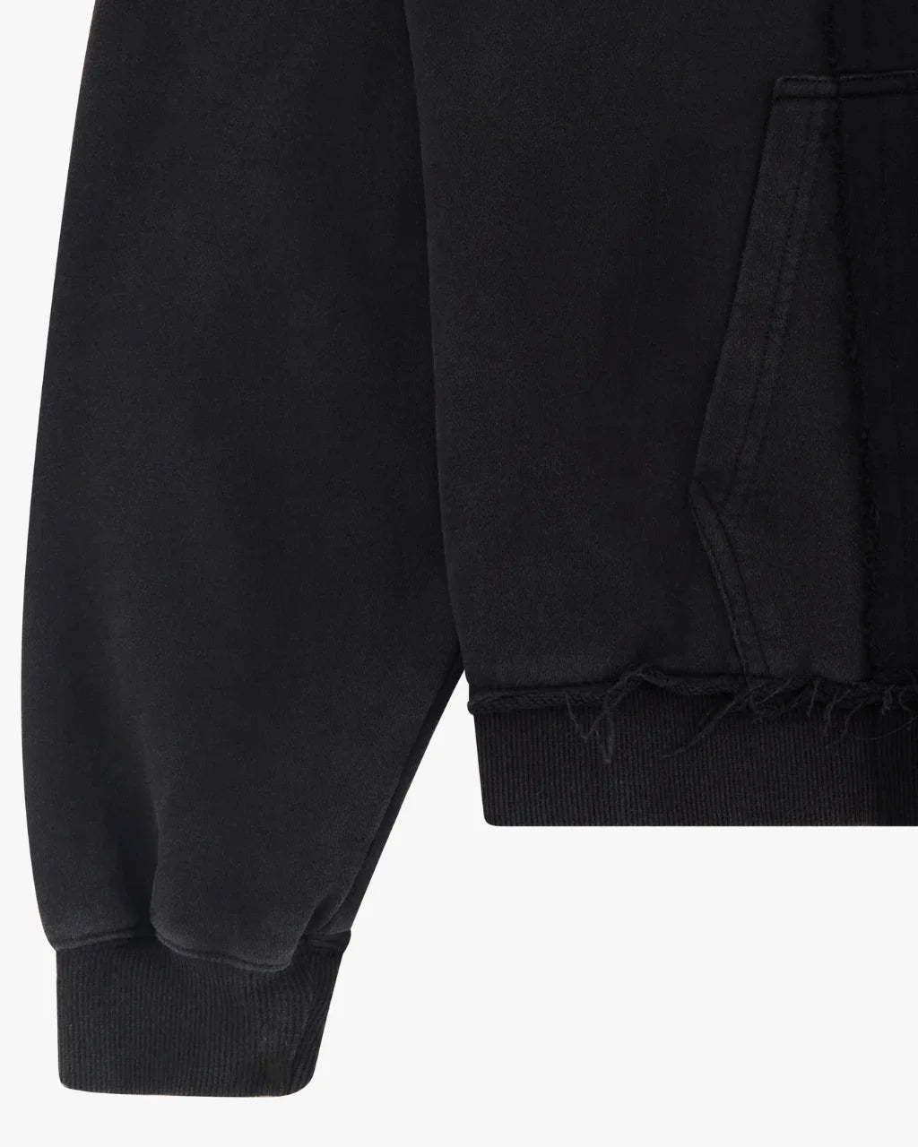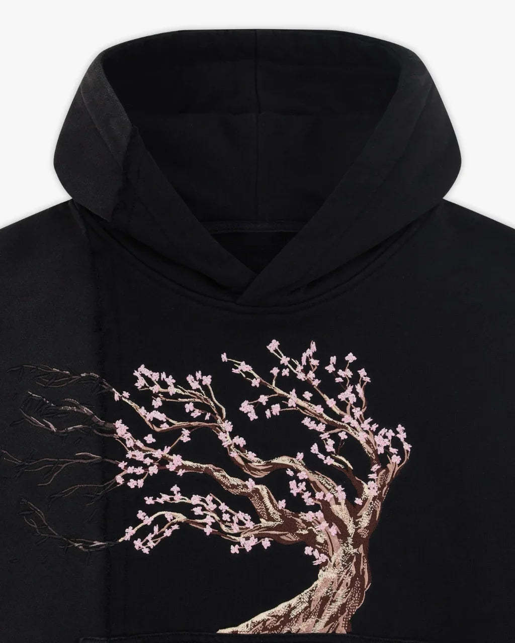 Features a fully embroidered cherry blossom tree rooted above the kangaroo pocket, transitioning from vibrant pink blossoms to bare, withering branches. This design follows the split construction of the hoodie, where deep black fades into dark grey.