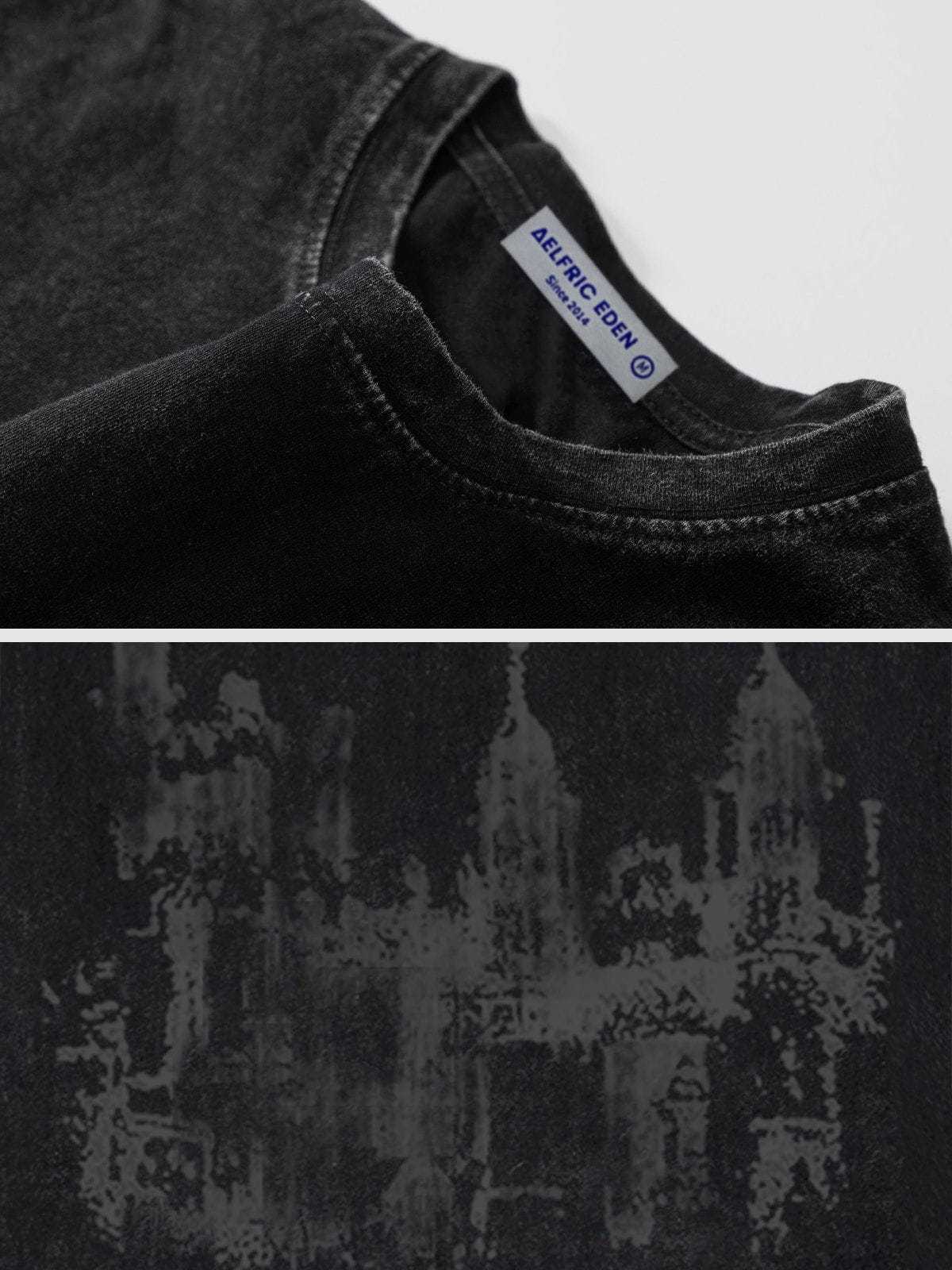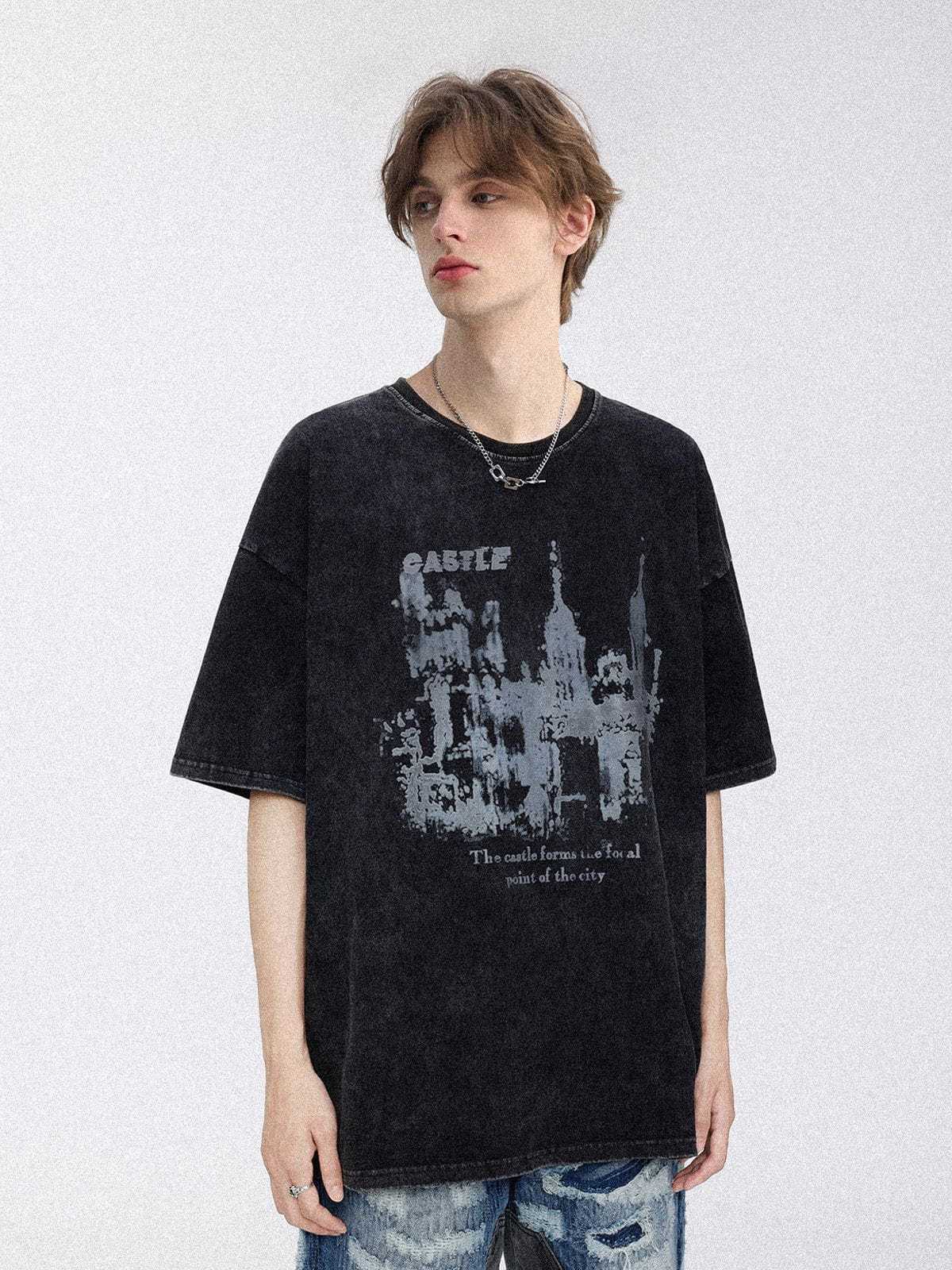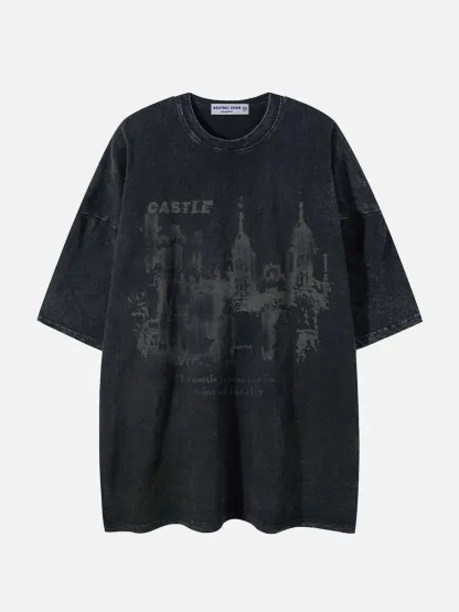 Discover a bold style and timeless look with A Castle Graphic Washed Tee. Crafted from soft cotton, this tee features a striking castle graphic and washed-tone for an edgy vibe. Elevate your wardrobe with this timelessly stylish piece.